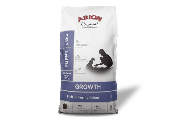 Arion Original Growth Chicken Large es un alimento completo para cachorros. Esta receta sin gluten, a base de pollo altamente digestible, contiene prebióticos y probióticos y niveles adecuados de vitaminas y minerales para proporcionar un enfoque multifuncional para la alimentación de tu cachorro en crecimiento.