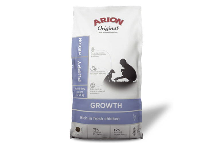 Arion Original Growth Chicken Medium es un alimento completo para cachorros. Esta receta sin gluten, a base de pollo altamente digestible, contiene prebióticos y probióticos y niveles adecuados de vitaminas y minerales para proporcionar un enfoque multifuncional para la alimentación de tu cachorro en crecimiento.